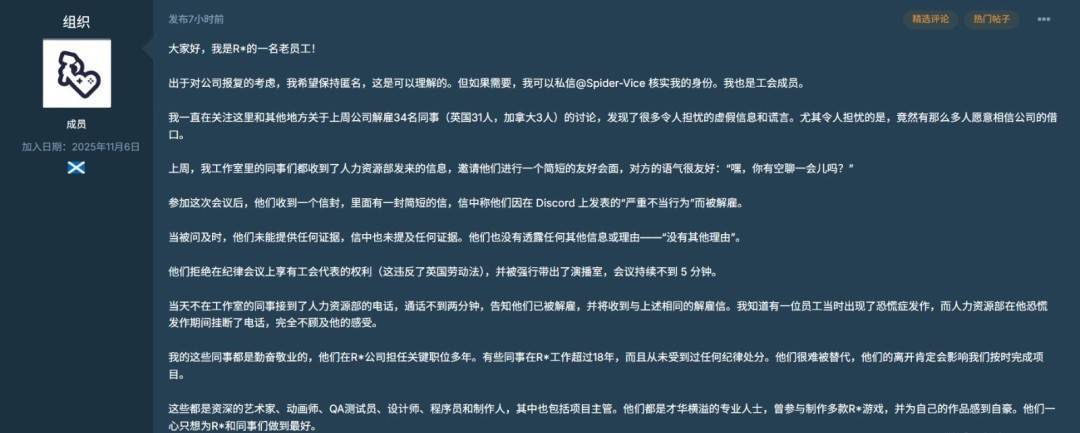 一位化名为Organize的匿名开发者在延迟公告发布后,于GTA论坛上详细披露了Rockstar的内部情况。他已向论坛管理员证实身份,确为Rockstar Games资深员工兼工会成员。